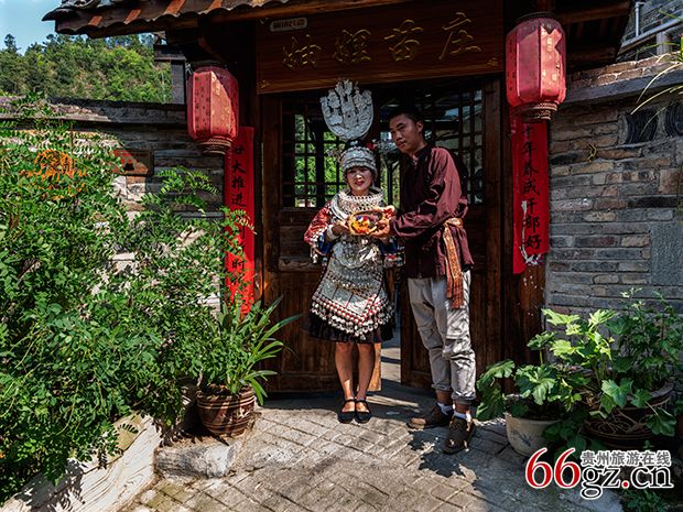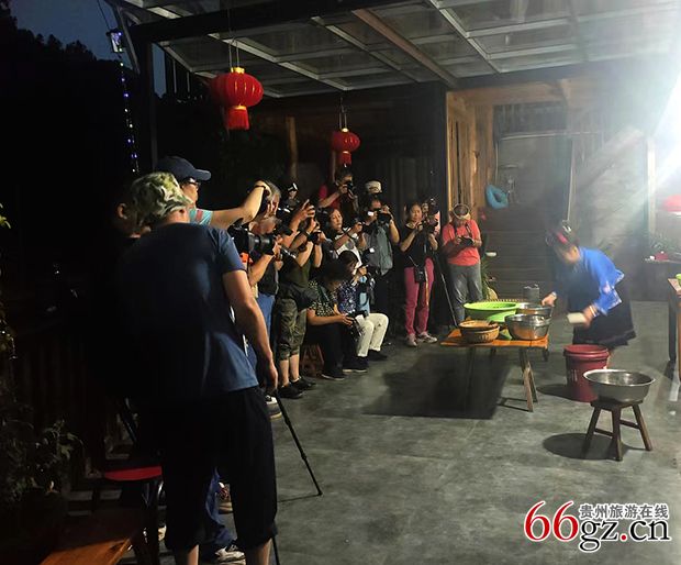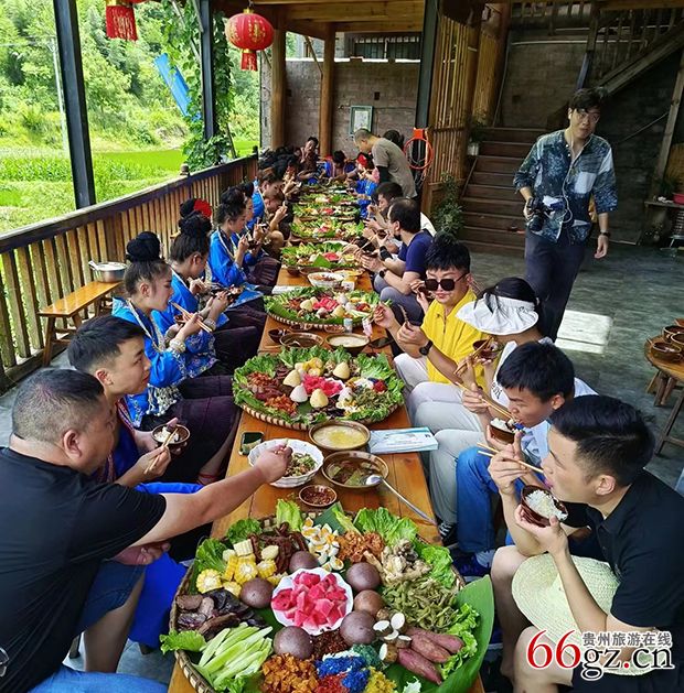开饭的时候,她们用簸箕装满各式各样的美食,摆放精美,看起来秀色可餐。并且这些都是苗家自己种养的食品:肉质细嫩却略有嚼头的家养白斩鸡、入口绵密的红薯、特制手法拌成的小菜、让人忍不住再来一碗的鸡粥……正当大伙吃的正香时,这家人用他们精心制作的苗家米酒(独木龙舟酒)端上桌面,当打开时,一阵清香飘来,香甜可口的米酒把我们的热情引入高潮,这时苗家甜美悠扬的敬酒歌唱响,我们一同醉在浓浓的妯娌苗庄的文化和米酒中。