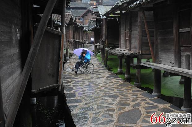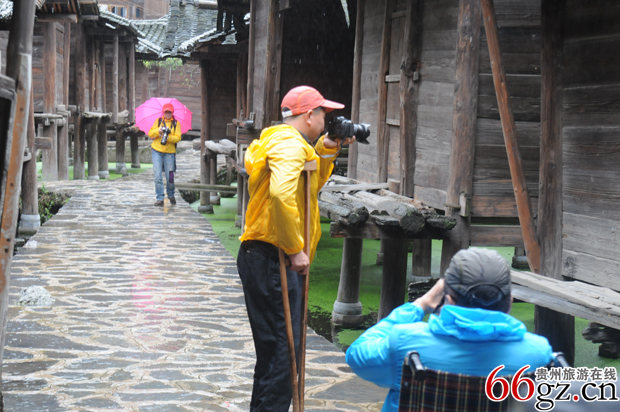 采风团队来到雷山时却逢小雨绵绵,但是这并不妨碍采风成员的热情,在水上粮仓,他们沿着反射着光亮的石板路,拿起手里的相机拍摄寨子里面那鲜为人知的一花一草,一木一屋,一人一景。