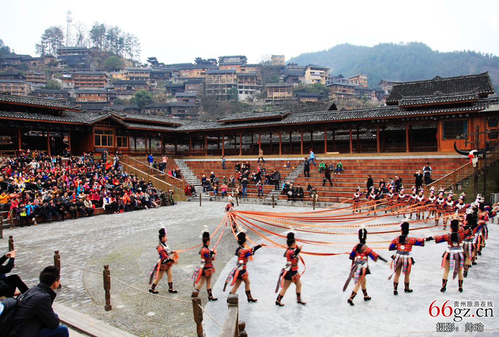 西江千户苗寨的苗族姑娘们每天穿着华丽的服饰,欢快地向来自全国各地的游客表演极富苗族文化的歌舞,这些古老的歌舞使人们了解了苗族人民的悠久历史和深厚的文化。这是苗族姑娘们在为游客表演歌舞《锦鸡姑娘》。