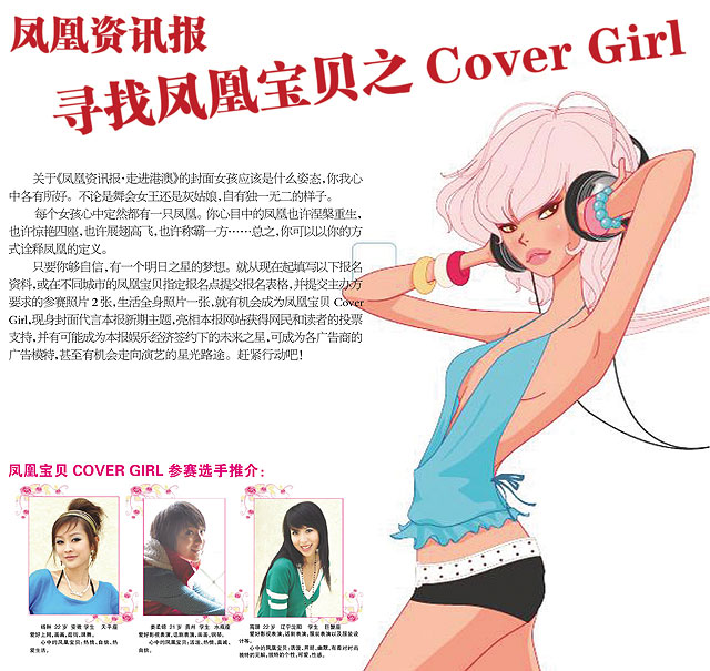只要你够自信,有一个明日之星的梦想。就从现在起填写以下报名资料,或在不同城市的凤凰宝贝指定报名点提交报名表格,并提交主办方要求的参赛照片2张,生活全身照片一张,就有机会成为凤凰宝贝cover girl,现身封面代言本报新期主题,亮相本报网站获得网民和读者的投票支持,并有可能成为本报娱乐经济签约下的未来之星,可成为各广告商的广告模特,甚至有机会走向演艺的星光路途。赶紧行动吧!