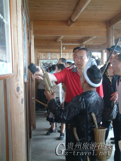 刚进寨,岜沙汉字们在寨门前吹奏芦笙、芒筒,一曲笙歌奏毕,火枪对天鸣放,表示盛情迎宾。沿林中石板小道进寨,开始岜沙探寻之旅。