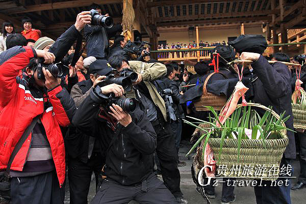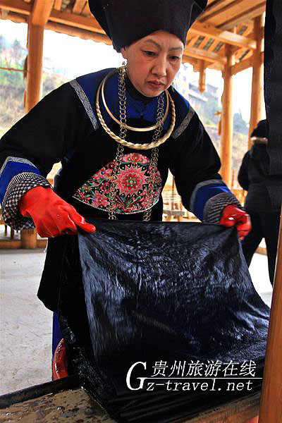 婚礼现场独具特色:苗族工艺“招待”来客。让你不但有口福,还可以饱眼福——一位苗族妇女在染布。