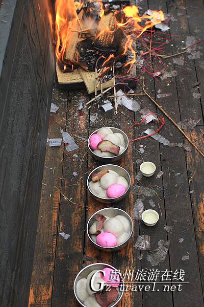 另外一姓的两位苗族老人在燃着纸、香的桥上面边上剥蛋壳准备贡品