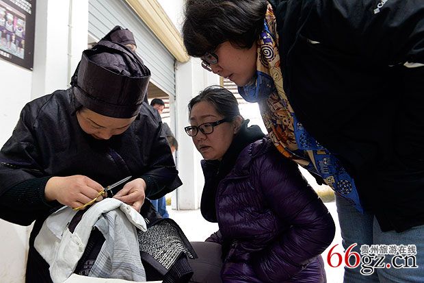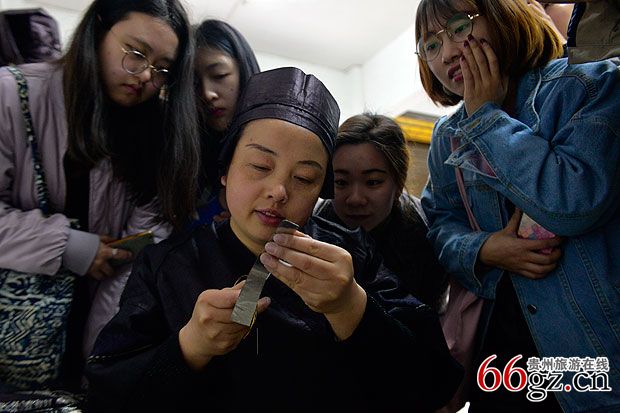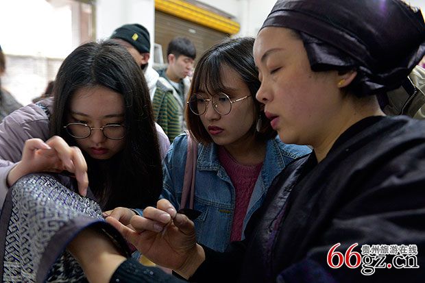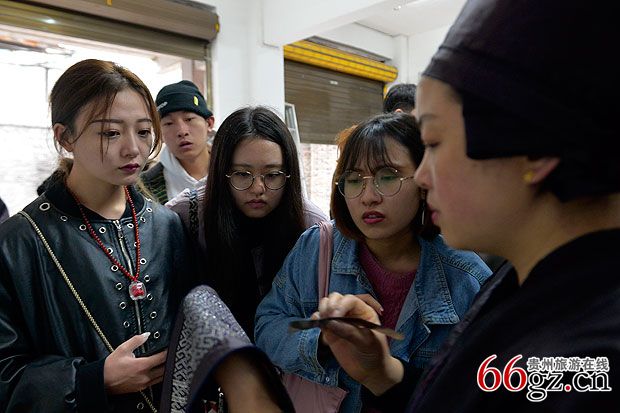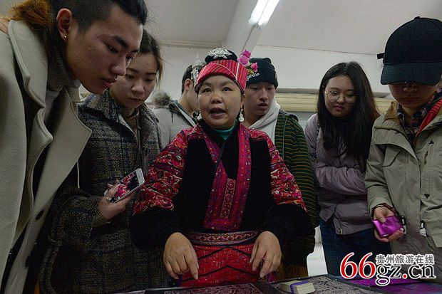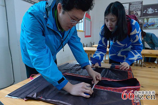 授牌仪式结束,剑河县非遗中心主任杨茂为学生们介绍了剑河县非遗文化情况。师生一同参观剑河县非物质文化遗产项目培训基地,国家级非物质文化遗产传承人姜文英等为师生现场讲解及示范红绣和锡绣刺绣工艺。