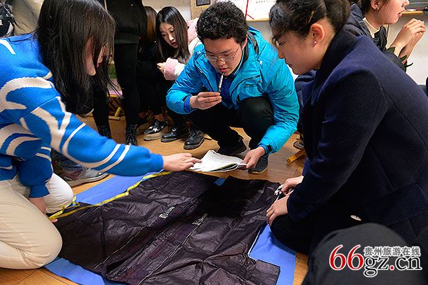 在剑河的第三天,师生参观苗族锡绣文化传承工艺坊。剑河的苗族锡绣,用金属材料“锡”绣制图案,制作工艺十分复杂和精巧,在贵州乃至全国丰富多彩的刺绣工艺中独树一帜。在苗族锡绣文化传承工艺坊,学生们跟着非遗传承人王亨石学习锡绣技法,并完成了锡绣苗衣的测绘。
