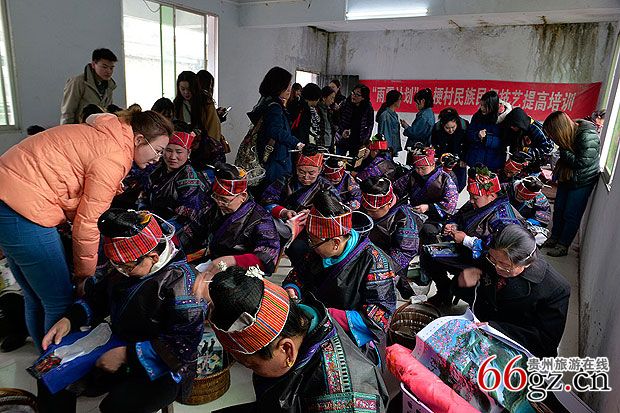 八梗村,以刺绣精美被熟知。当地苗族妇女擅长破线绣。其苗衣上的刺绣为破线绣和叠绣的组合,因技法难度高、成品精美,村里组建了苗族传统手工刺绣专业合作社以及文化传承工坊。师生在村里与绣娘们交流,绣娘一边解答,一边展示绣片,场面融洽。
