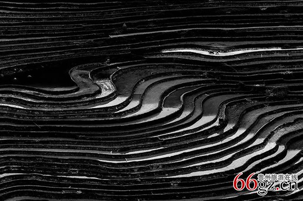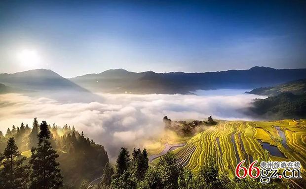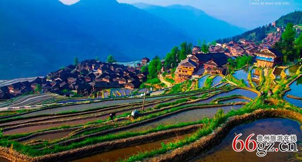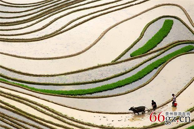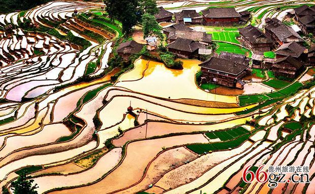 有些地方在这些梯田中间还散落着苗乡独具特色的村寨以及行走于田间的劳作者,犹如点缀在夜空里的星星。(本文图片提供:从江县旅游局)
