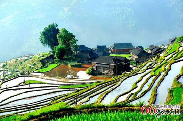 加鸠梯田总面积多达几十万亩,只要有沟谷溪流的地方就有梯田。梯田紧靠溪河,常年雨水充沛,所以一年四季,每天清晨,都有一层层云雾从河边缓缓升起,这些美丽的梯田连同梯田边上的吊脚楼全都被笼罩在云雾中,远远望去若隐若现,飘渺悠然,如梦如幻。